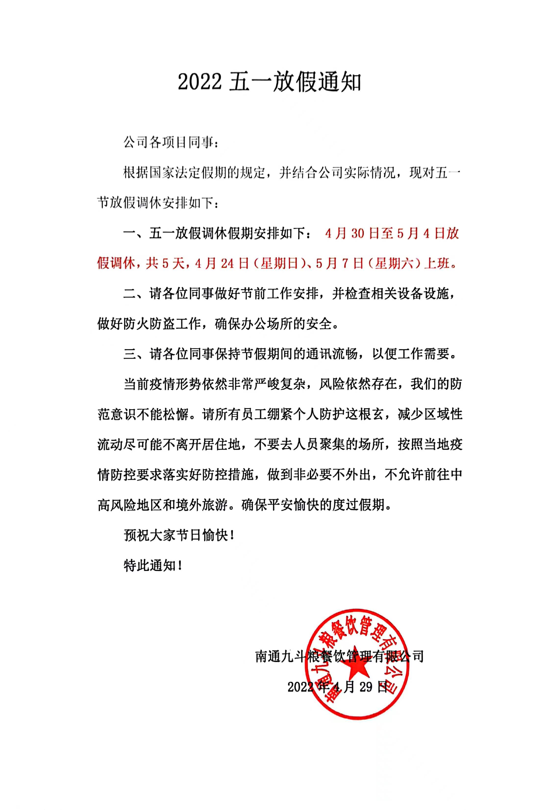 2022五一放假通知